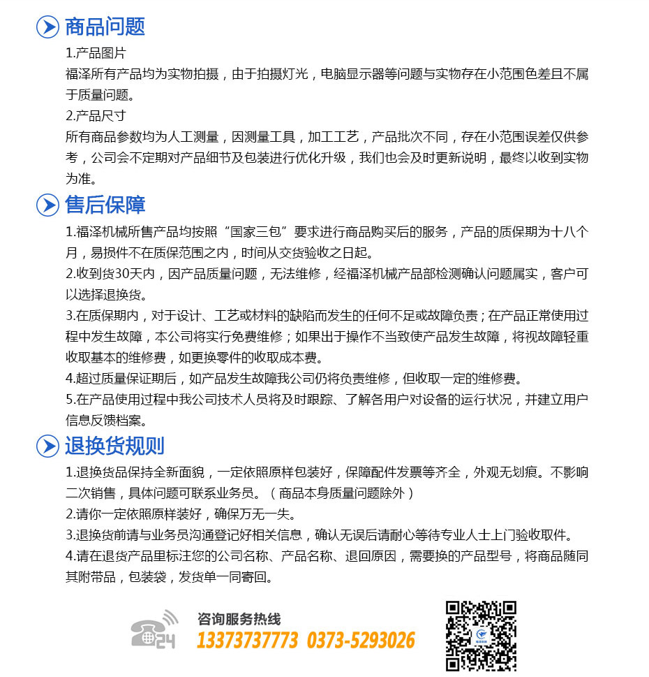 2、收到貨30天內(nèi),因產(chǎn)品質(zhì)量問題,無法維修,經(jīng)福澤機(jī)械產(chǎn)品部檢測確認(rèn)問題屬實,客戶可以選擇退換貨。